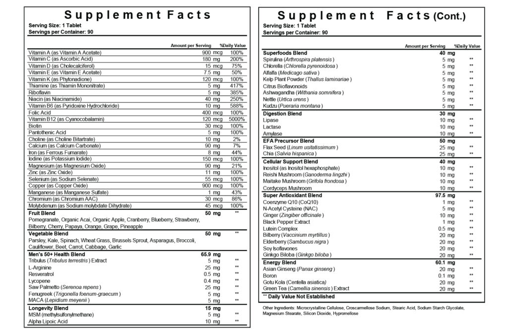 Reload for Men 50+ Platinum advances our 50+ formula with thoughtfully selected ingredients to complement essential daily nutrients. Featuring Saw Palmetto, Tribulus, Maca, L-Arginine, CoQ10, ginkgo, and alpha lipoic acid, this formula supports men looking for a more robust daily regimen. With added superfoods, enzyme support, and antioxidant blends, Platinum provides a refined and comprehensive approach to nutrition for men over 50.