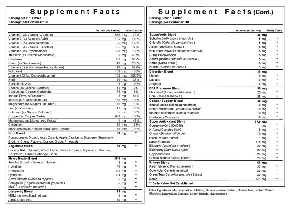 Reload for Men Platinum is an elevated evolution of our core men’s formula, combining comprehensive vitamin and mineral support with advanced performance-focused blends. Featuring Tribulus, Saw Palmetto, Maca, Fenugreek, CoQ10, NAC, and alpha lipoic acid, this formula is crafted for men who expect more from their daily routine. With added superfoods, digestive enzymes, and targeted antioxidant support, Platinum delivers a more complete and refined approach to everyday nutrition.